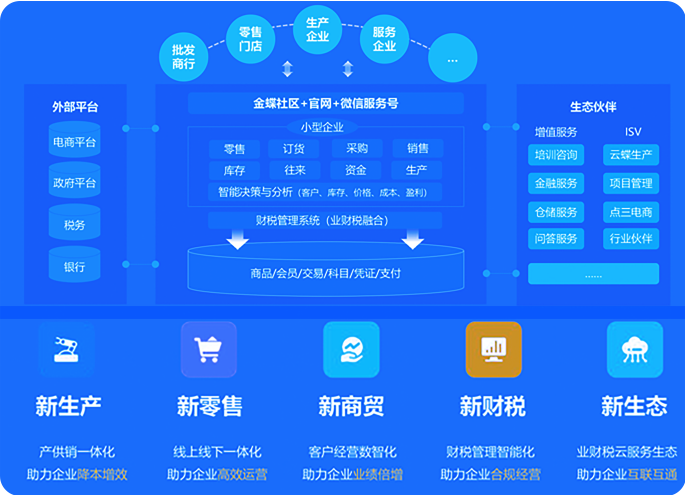 金蝶云·星辰基于金蝶云·蒼穹云原生PaaS平臺構建,聚焦小型企業在線經營和數字化管理,提供財務云、稅務云、進銷存云、零售云、訂貨商城等SaaS服務,支持企業拓客開源、智能管理、實時決策; 金蝶云·星辰還提供輕量級PaaS平臺和全面的API接口,廣泛連接生態伙伴,為小微企業提供一站式服務,助力企業快速成長